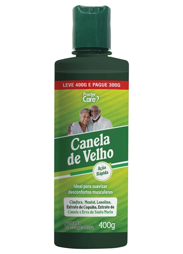 Composto por: 1 Pomada massageadora canela de velho. Suaviza desconfortos musculares, com ação rápida. Contém cânfora, mentol, lanolina, extrato de copaíba, extrato de canela, e erva de Santa Maria. 400 g. Imagens meramente ilustrativas.