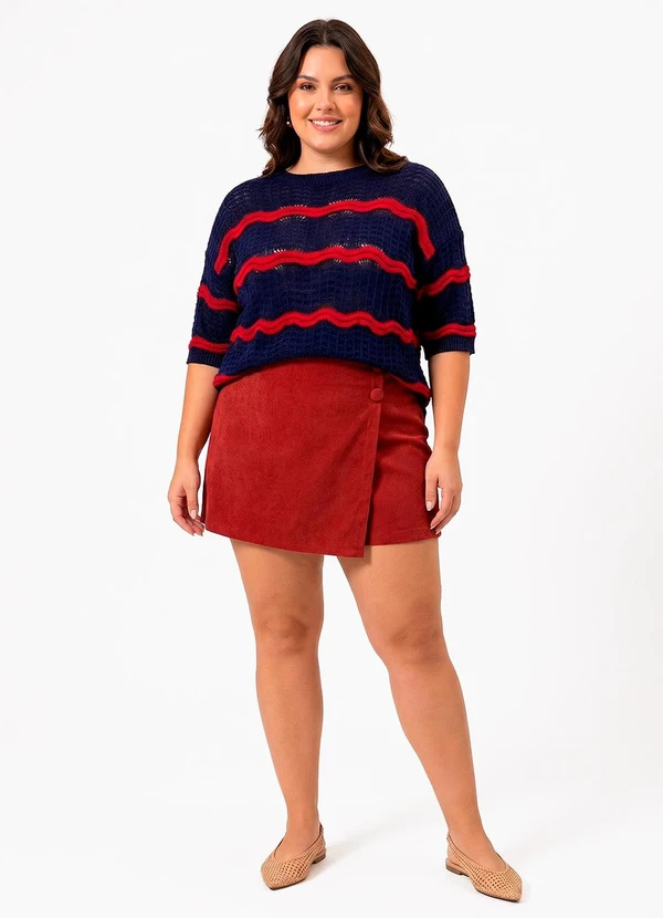Blusa Azul Marinho em Tricô. Com textura macia e listras onduladas vinho, esta peça de modelagem reta e soltinha é perfeita para o dia a dia e trabalho. Decote redondo clássico e mangas curtas. Elegância e versatilidade garantidas!