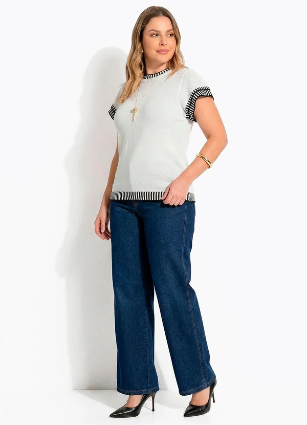 Blusa branca em tricot acrílico com algodão , com modelagem solta e acabamentos listrados em preto na gola, mangas e barra. Moderna e confortável, combina charme e sofisticação. Versátil, é perfeita para compor looks de trabalho ou lazer com elegância.