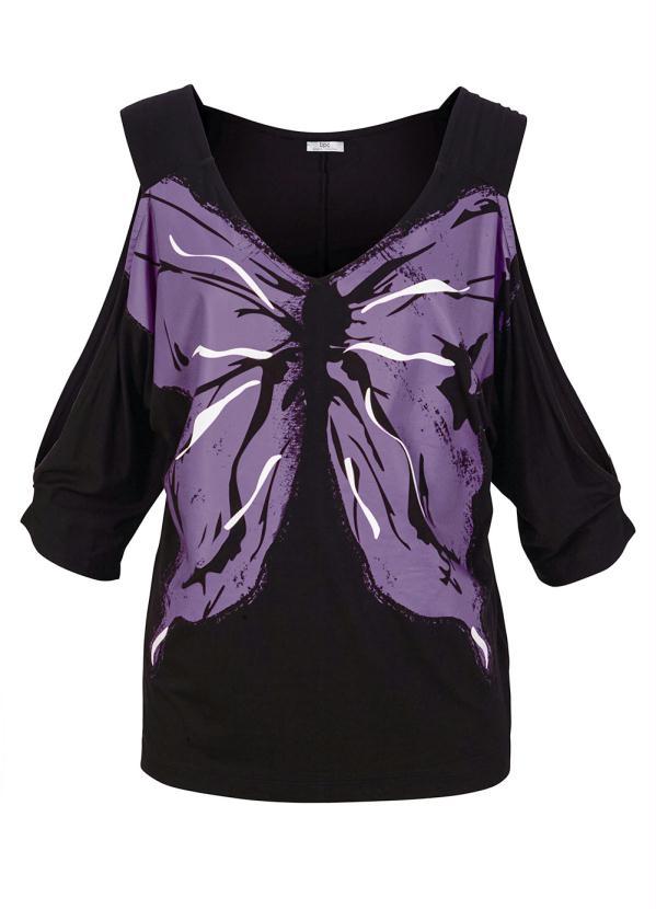 bonprix - Blusa Ombro Vazado Estampa Borboleta Preta