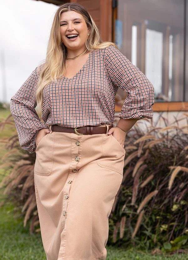 A Blusa xadrez marrom em malha fria, com decote V e mangas longas bufantes com elástico no punho. Caimento leve e confortável, ideal para compor looks casuais com um toque moderno. Esta peça versátil é perfeita para combinar com jeans ou saias, criando visuais despojados e estilosos para o dia a dia.