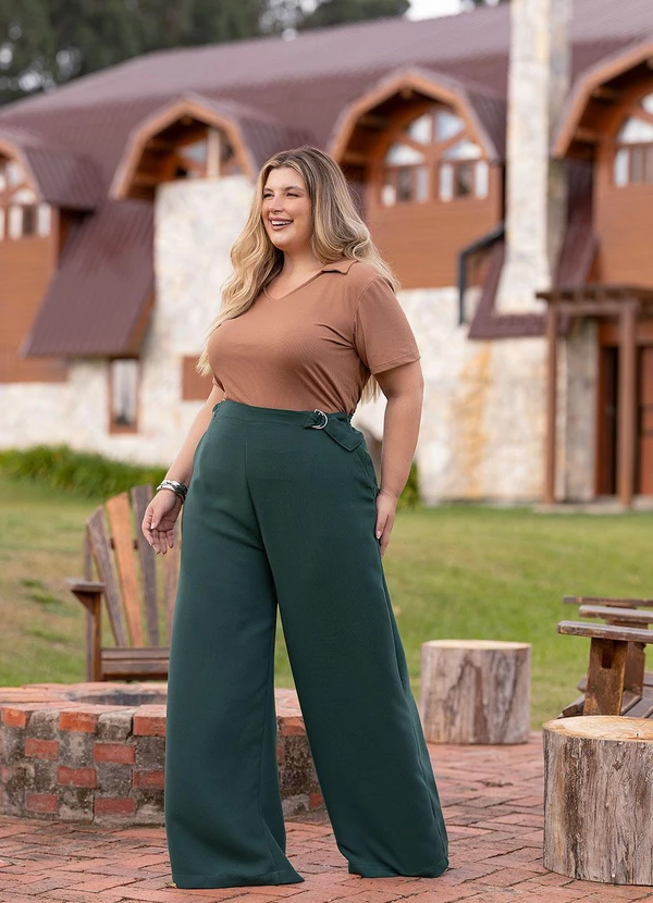 A Calça verde em tecido de alfaiataria leve. Possui modelagem reta e solta, cintura alta com recortes laterais e detalhe de regulagem por fivelas metálicas. O caimento fluido garante sofisticação e conforto. Essencial para looks de trabalho ou para ocasiões que exigem elegância, combinando versatilidade e praticidade.