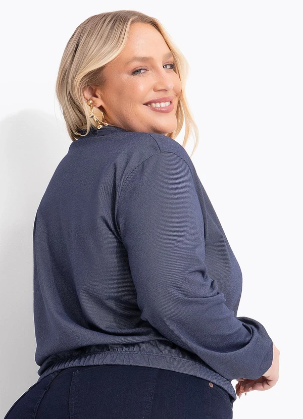 A jaqueta leve em malha que remete ao visual do jeans, com toque macio e textura sutil, possui gola alta, fechamento frontal por zíper e mangas longas. Barra com leve ajuste, garantindo caimento confortável e moderno para o dia a dia. Este casaco em malha Denim apresenta estampa de listras azul e branca, ideal para looks casuais e versáteis em diversas ocasiões, combinando estilo e praticidade.