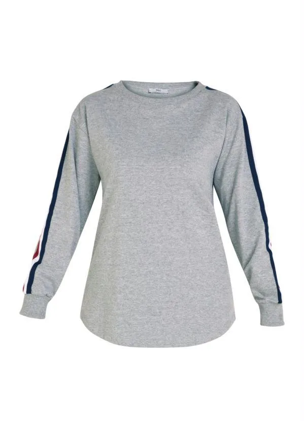 Casaco em moletinho leve sem pelúcia, toque macio. Modelo com decote redondo, mangas longas com punho e faixa sobreposta listrada nos ombros e mangas.