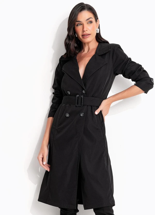O Sobretudo Trench coat em tecido de alfaiataria sarjado na cor preta, com lapelas clássicas, fechamento transpassado e cinto com fivela para ajuste da cintura. Possui mangas longas com detalhe nos punhos martigale, bolsos laterais e caimento estruturado que garante elegância e versatilidade. Ideal para compor looks modernos e atemporais, é perfeito para sobreposições estilosas em diversas ocasiões, do casual ao mais sofisticado.