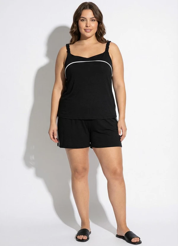 Conjunto preto com viés contrastante, top de alças com efeito frufru e decote reto com elástico nas costas para segurança. Shorts curto com bolsos e cintura elástica, garantindo conforto e estilo.
