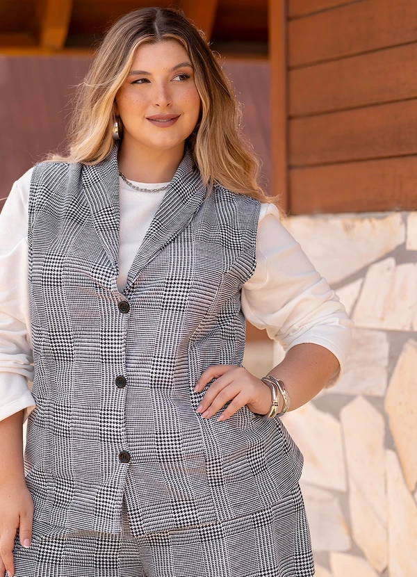 O Conjunto xadrez preto e branco em moletinho oferece um look moderno e elegante. O colete sem mangas possui gola lapela e fechamento por botão, enquanto o shorts conta com cós elástico nas costas para conforto e ajuste perfeito. Perfeito para produções casuais sofisticadas, este conjunto é versátil para o dia a dia e eventos descontraídos.