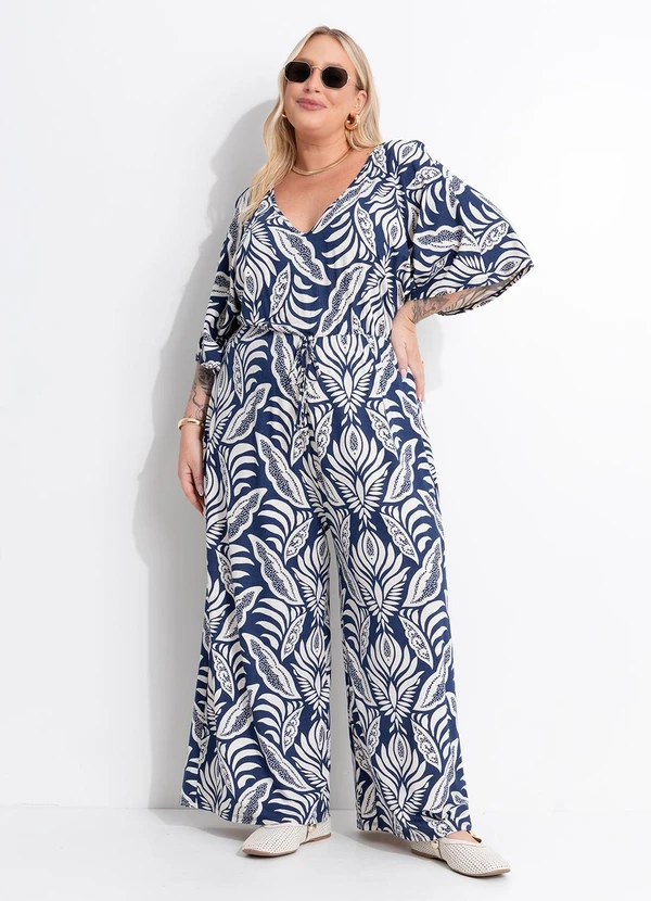 Marguerite - Macacão Folhagem Azul Pantacourt em Malha de Viscose