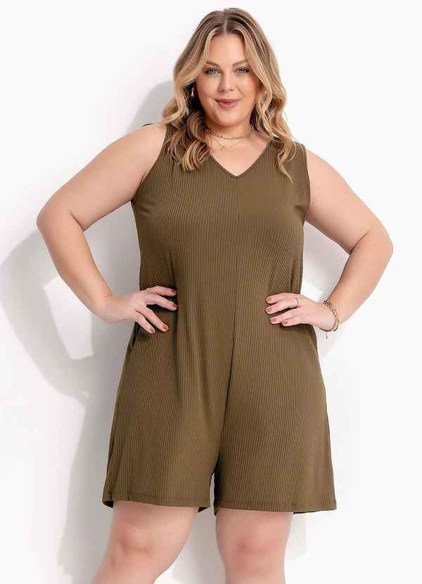Macacão verde em ribana canelada, com comprimento curto e toque macio. A peça une praticidade e estilo com modelagem ajustada ao corpo, valorizando a silhueta com conforto. Ideal para looks casuais e versáteis no dia a dia.