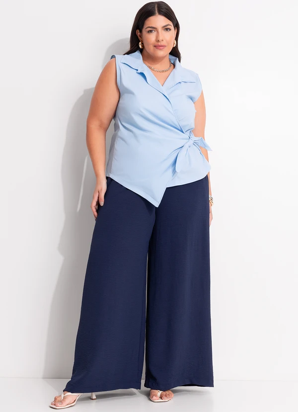 Blusa azul claro em tricoline, com modelagem solta e comprimento longo. Decote com gola e detalhe para amarrar que adiciona charme ao visual. Fechamento com amarração interna. Leve e elegante, ideal para composições modernas e versáteis.