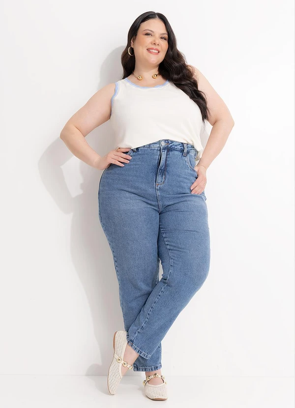 Blusa off white, estilo regata feita em algodão. Possui decote com retilinea azul bebê, que da um efeito delicado e romântico.