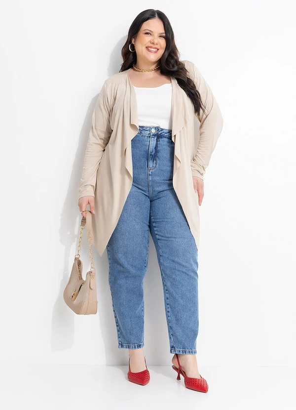 Cardigan bege em viscose com elastano, modelagem com pontas frontais que alongam a silhueta. Leve e confortável, é a terceira peça perfeita para compor looks elegantes e versáteis em qualquer estação.