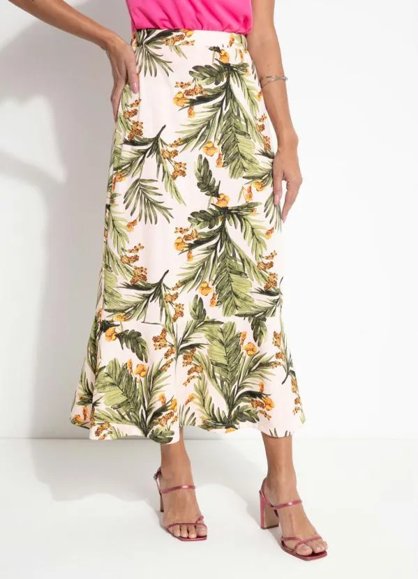 Moda Evangélica. Saia em helanca. Modelo com elástico no cós, babado na barra e recorte central no traseiro da saia. Cintura alta. Comprimento midi.