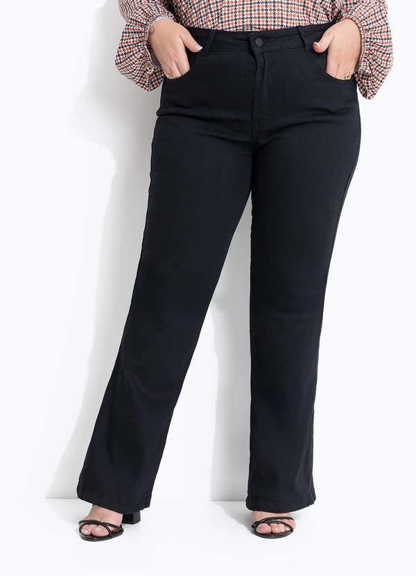Calça jeans flare preta com elastano, modelagem que valoriza as curvas com ajuste confortável no quadril e coxas e abertura suave na barra, alongando a silhueta. Cintura média, fechamento por botão e zíper, bolsos funcionais e acabamento versátil para o dia a dia.