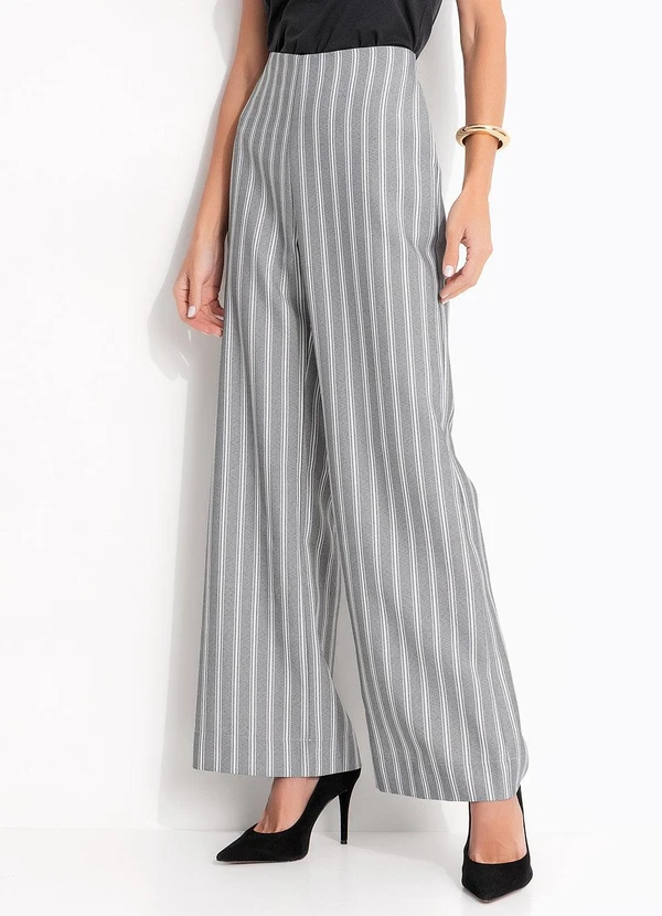 A calça listrada cinza, modelagem reta com leve abertura na barra. Cintura alta com cós liso e zíper no centro traseiro. Possui bolsos laterais e caimento confortável. Listras verticais que alongam a silhueta e garantem visual moderno e versátil. Em tecido de alfaiataria de poliéster, oferece caimento impecável e elegância para diversas ocasiões, do trabalho ao lazer.