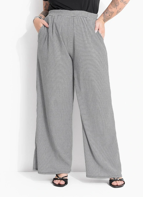 Calça Plus Size xadrez pied poule, perfeita para o trabalho. Confeccionada em malha texturizada, oferece caimento impecável e conforto extra. O cós liso e os bolsos laterais adicionam praticidade e um toque de sofisticação vintage. Combine com blusas neutras para um look elegante e profissional, ou ouse com cores vibrantes para um visual moderno e cheio de personalidade. Essencial para um guarda-roupa versátil e chic!