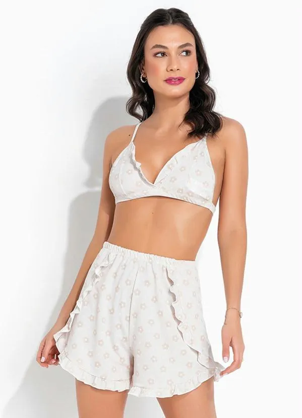 Pijama em poliéster. Modelo com alças e babadinho no decote. Shorts com babadinho com elástico na cintura.