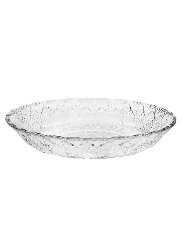 1 Prato para bolo em vidro com acabamento decorado e borda elevada.