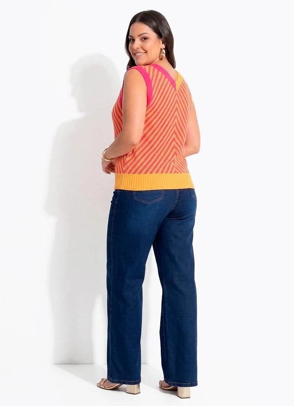 Blusa regata em tricô. Com decote V e estampa chevron em rosa fúcsia e laranja, ela garante um visual vibrante. Confortável e versátil, perfeita para o dia a dia e ocasiões especiais. Destaque-se com esta peça única!