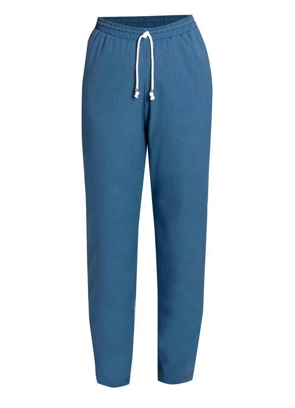 Calça, em tecido de poliéster, viscose e linho. Possui bolsos faca nas laterais, e elástico na cintura com amarração decorativa. Comprimento Cigarrete. Cintura Média.