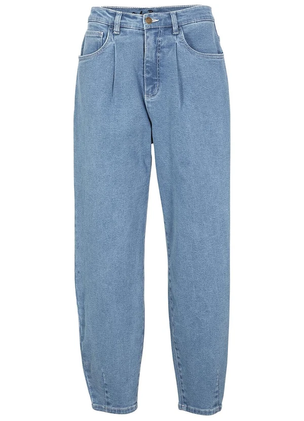 Calça jeans claro, modelagem solta estilo baggy, cintura média, comprimento cigarrete, bolsos funcionais, fechamento em botão, material jeans.