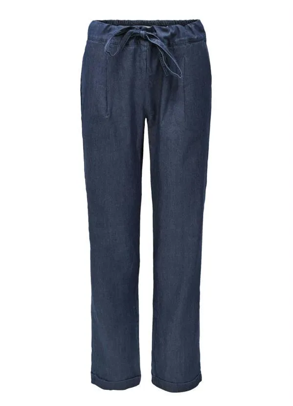 Calça em jeans leve com franzido na parte traseira e pregas na parte dianteira. Bolsos faca nas laterais e barra dobrada. Fechamento com amarração frontal. Modelagem confortável e contemporânea.