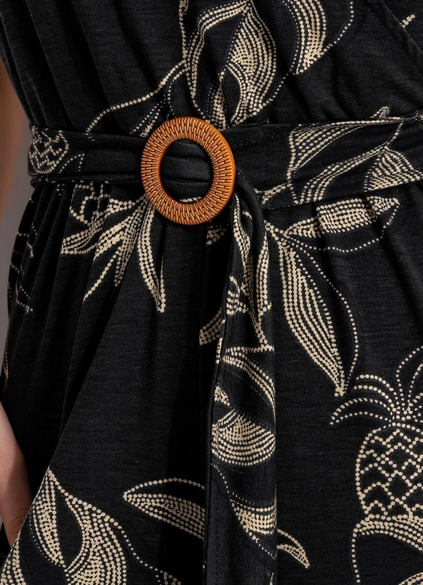 Macacão longo estampado com fivela. Estampa de folhagem marinho, material malha de viscose com elastano.