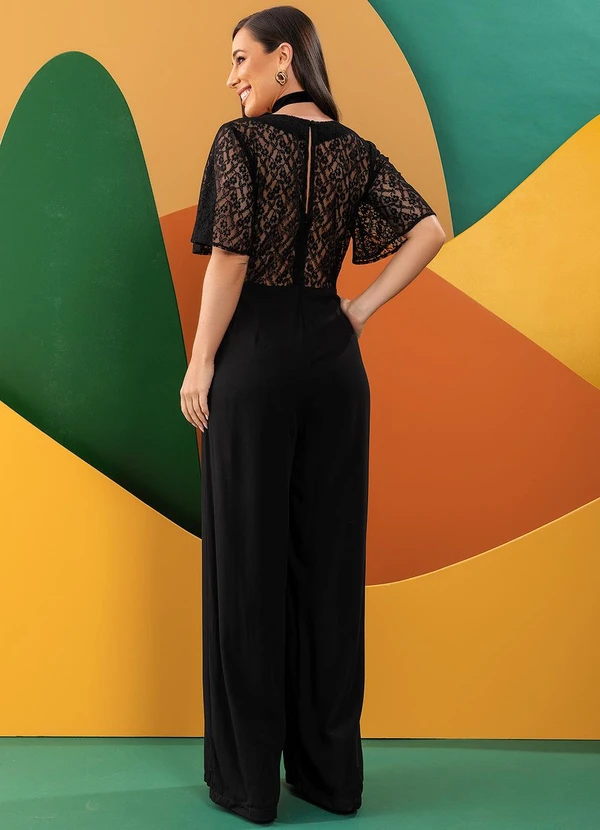 Quintess - Macacão Preto em Viscose Plana e Renda