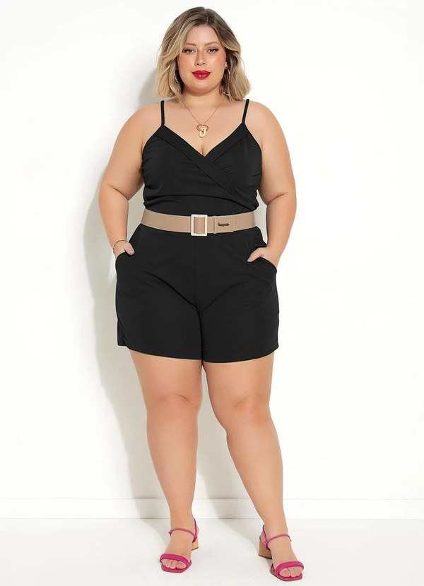 Macaquinho preto, modelagem solta, decote frente transpassado, decote costas reto, com alça, bolso embutido, comprimento curto, material malha de poliéster.
