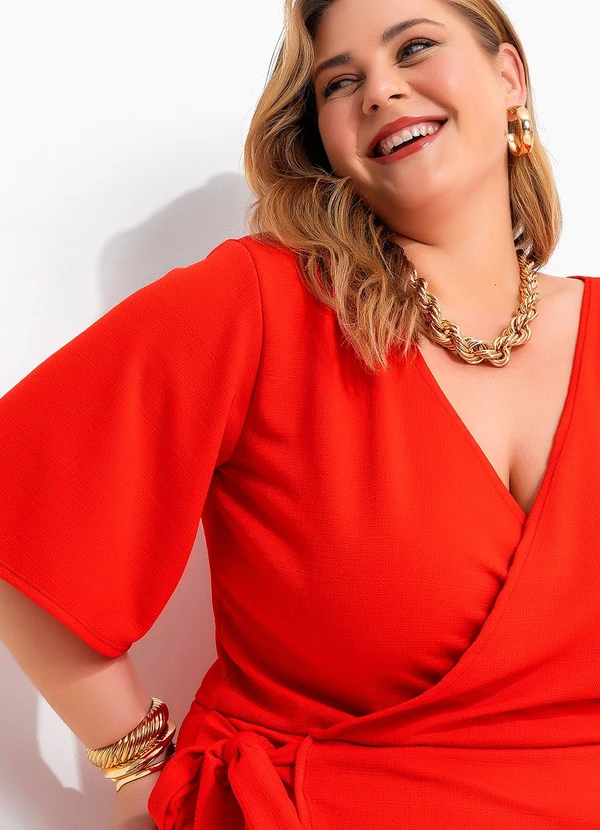 Este macaquinho moderno apresenta um design de short saia, criando um look contemporâneo e feminino. Deixe-se encantar por sua vibrante cor vermelha, sinônimo de alegria e prosperidade.