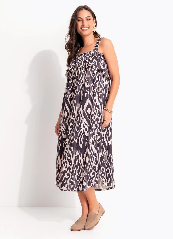 Vestido comprimento longuete com elástico no busto e decote reto com babados. Alça larga com efeito franzido, perfeito para dias de sol.