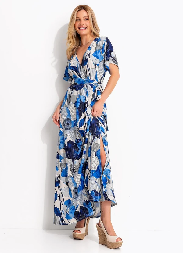 Vestido longo em tecido leve com estampa floral em tons de azul. Modelagem transpassada com decote em V e amarração na cintura que valoriza a silhueta. Mangas amplas conferem movimento e conforto ao look.