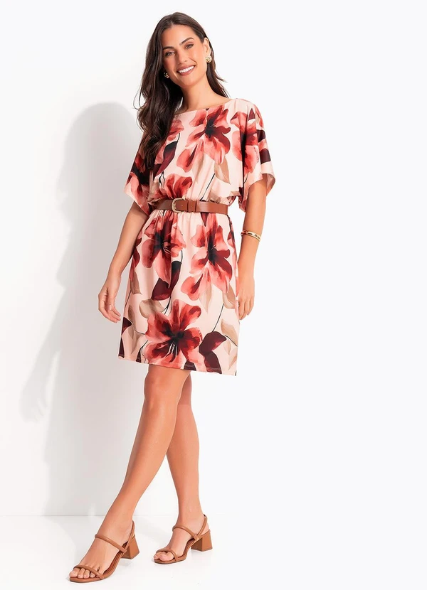 Vestido estampado comprimento clássico com decote canoa e estampa floral grande feito em malha fria. Cintura com elástico.