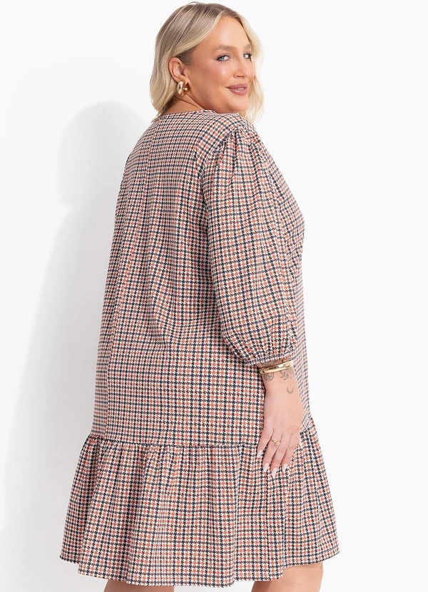 O Vestido em malha fria estampada xadrez, com gola franzida e amarração. Mangas 3/4 e recorte franzido na linha do quadril, criando leve volume na saia. Caimento confortável e comprimento clássico, ideal para looks casuais modernos. Versátil e estiloso, esta peça é perfeita para diversas ocasiões, combinando conforto e um toque vintage glamuroso.