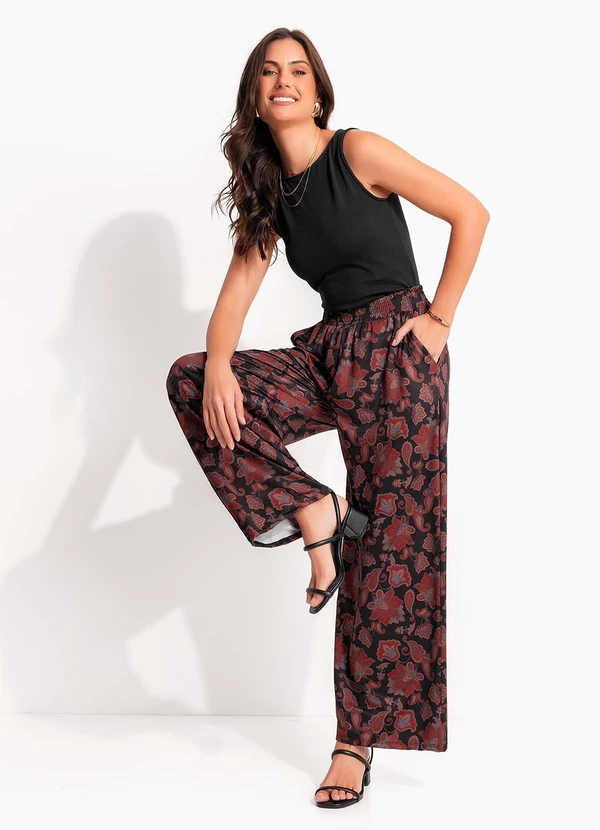 Calça pantalona estampada de malha fria com elástico na cintura e cordão decorativo com tassel no cós.