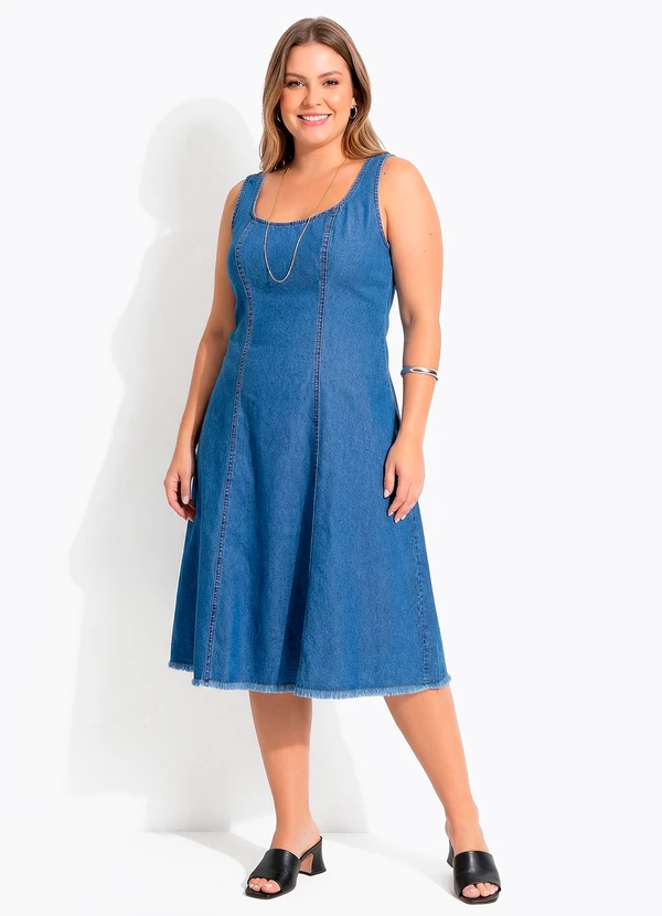 Vestido jeans midi com modelagem evasê e decote arredondado. Possui recortes verticais que alongam a silhueta e valorizam o caimento. As alças largas garantem conforto e sustentação. Versátil e atemporal, é ideal para composições casuais e elegantes.