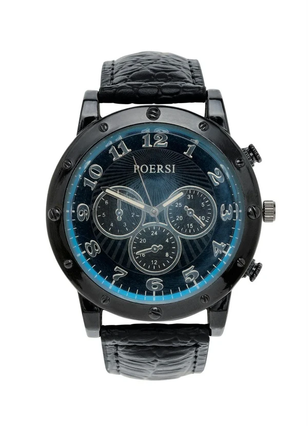 Relógio analógico em metal com pulseira em material sintético. Fechamento por fivela de ajuste. Caixa redounda preta e mostrador preto.