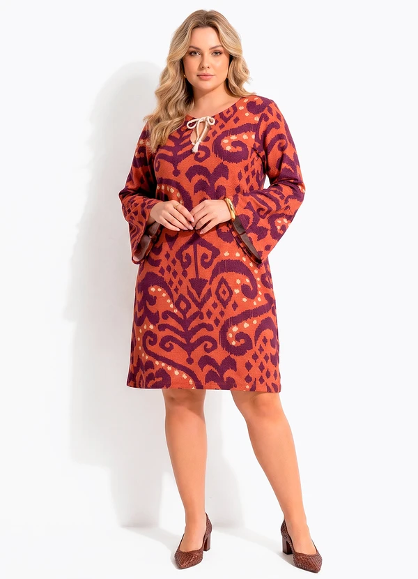 Vestido curto em malha estampada com estampa geométrica em tons terrosos e vinho. Modelagem reta com decote em V e mangas 7/8 levemente amplas. Peça moderna e confortável, ideal para composições casuais elegantes.