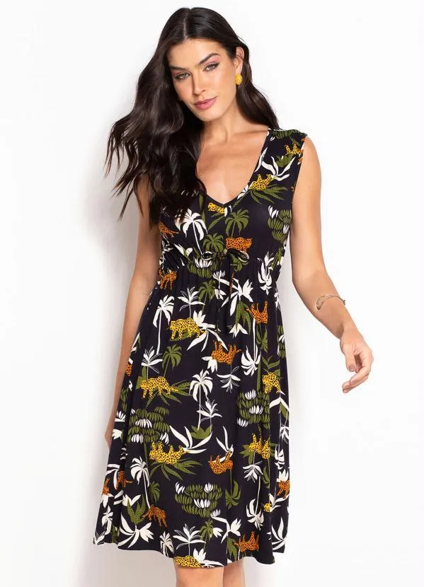 Vestido em viscose com elastano. Possui decote frente em V e costas redondo, detalhe para amarrar e elástico na cintura. Comprimento acima do joelho.
