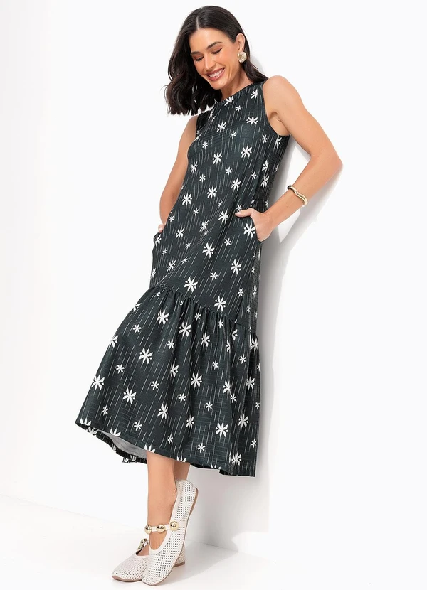 Vestido longuete estampado malha texturizada, perfeito para quem busca sofisticação e praticidade. Peça fluida e confortável para qualquer ocasião.