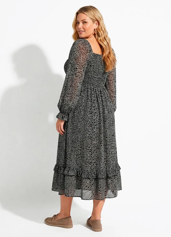 Vestido preto em poliéster com estampa floral liberty. Possui busto em lastex, decote quadrado charmoso, mangas longas bufantes e bolsos laterais funcionais. A modelagem midi conta com caimento fluido e babados na barra, adicionando delicadeza ao visual. Versátil e feminino, é ideal para trabalho ou eventos casuais.