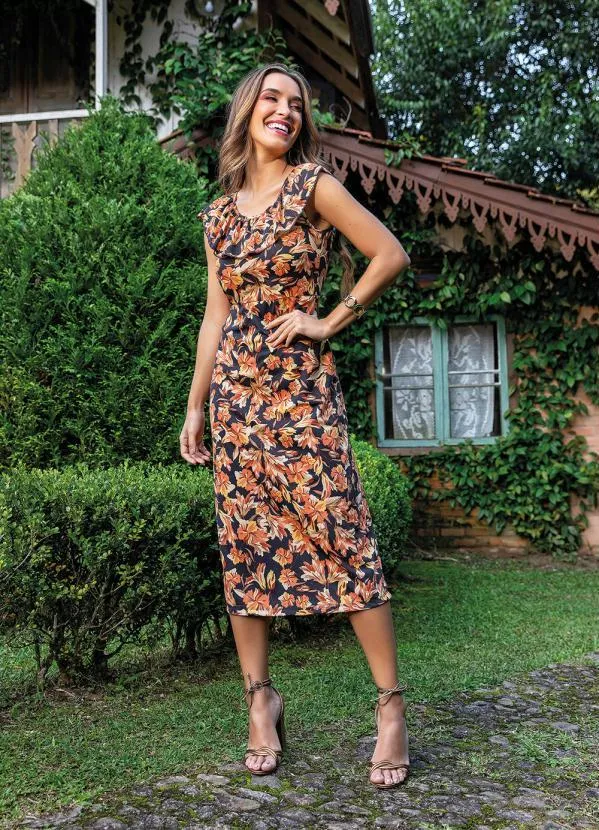 Vestido em helanca. Modelo com decote levemente quadrado com babado, recorte na cintura e recorte central no traseiro da saia. Comprimento midi.